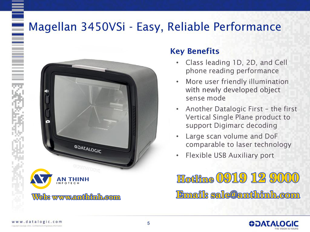 Dòng máy quét mã vạch Magellan ™ 3450VSi tiếp nối Datalogic truyền thống về hình ảnh hiệu suất cao cho điểm bán hàng số lượng lớn. Bằng cách nhân đôi tốc độ và trường nhìn lớn của tia laser máy quét và mở rộng khả năng chụp ảnh, 3450VSi máy quét cung cấp hiệu suất vượt trội trên các mã vạch khó đọc và đọc liền mạch nhiều loại mã vạch. Máy quét Magellan này hỗ trợ cả kỹ thuật quét tốc độ cao và quét trình bày, đảm bảo năng suất tối đa và tính tiện dụng, ngay cả với các mã bị cắt bớt (rút gọn), không có thông số kỹ thuật hoặc mã được in kém.
