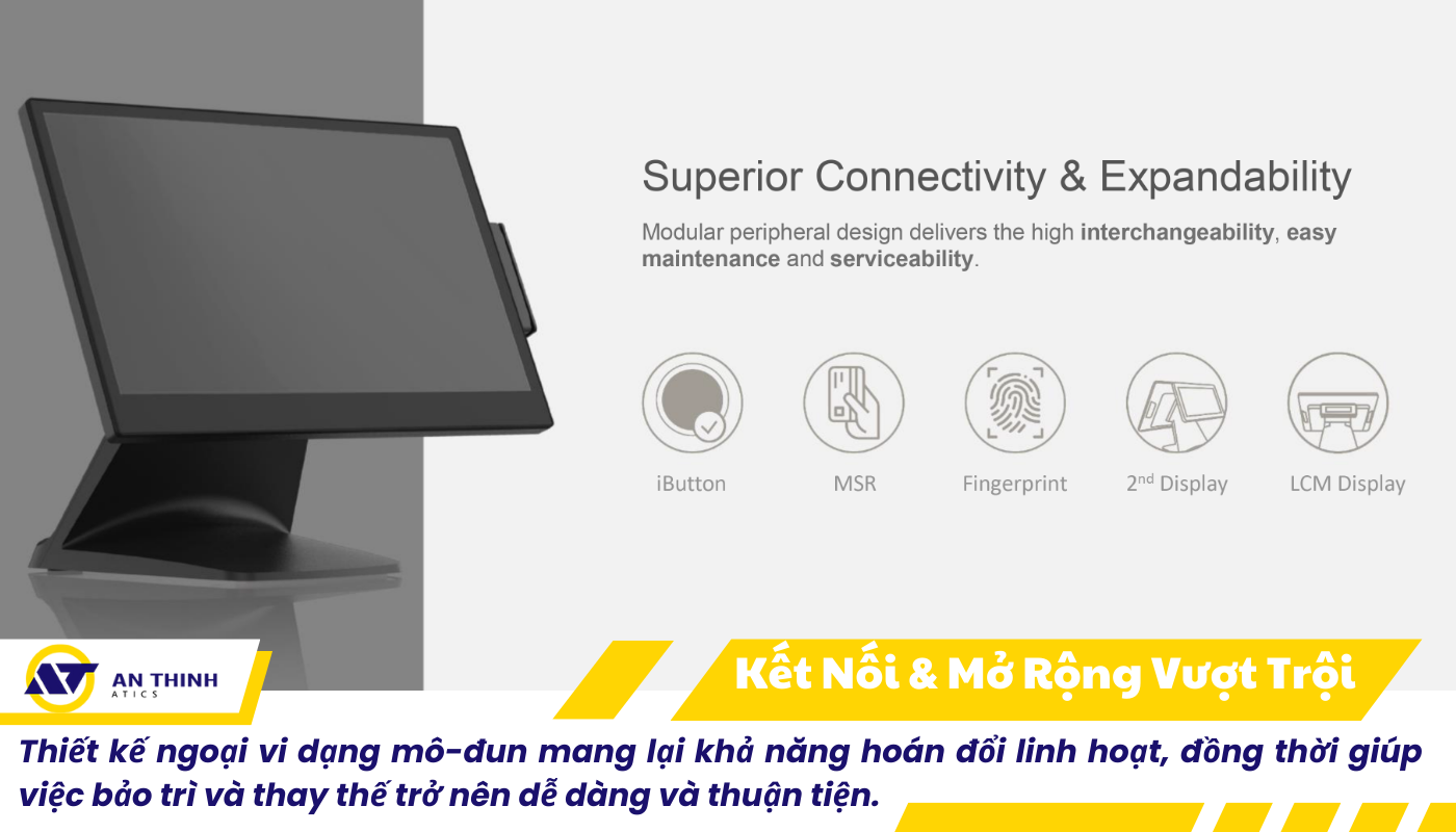 Thiết kế không quạt (fanless) giúp loại bỏ hoàn toàn tiếng ồn khi vận hành, đồng thời giảm thiểu bụi bẩn bám vào bo mạch, nâng cao tuổi thọ thiết bị – đặc biệt hữu ích trong môi trường F&B thường xuyên có bụi, khói, dầu mỡ.