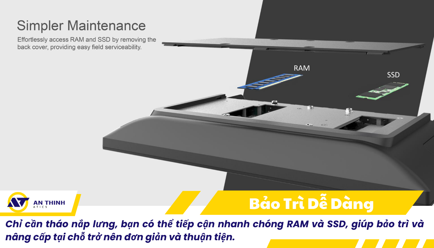 Chỉ với thao tác tháo nắp lưng đơn giản, kỹ thuật viên có thể dễ dàng truy cập RAM và SSD để nâng cấp hoặc bảo trì thiết bị tại chỗ mà không cần gửi về trung tâm bảo hành.